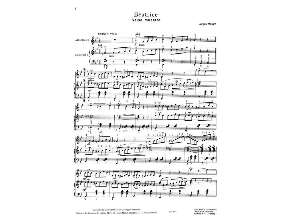 Pět skladeb pro sólový akordeon ve stylu francouzského musette s volitelným partem pro druhý akordeon.