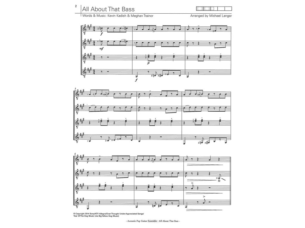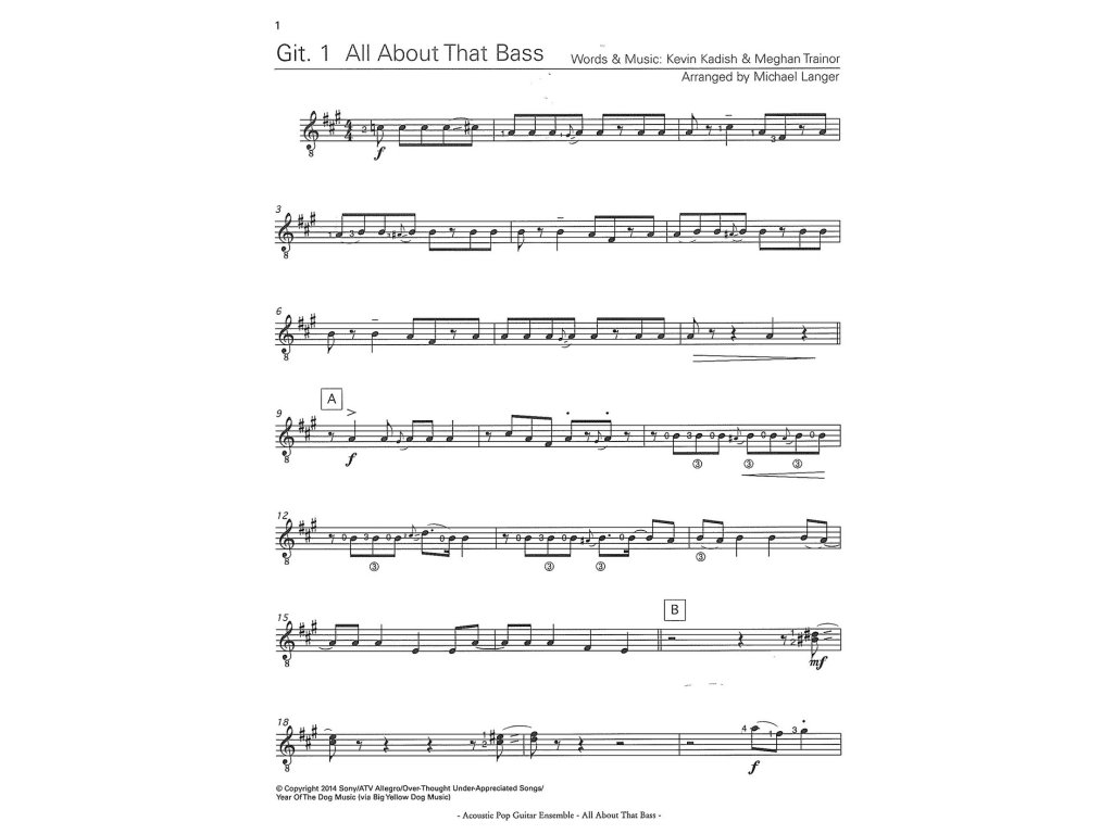 "All About That Bass" je velký hit roku 2014, debutová píseň americké zpěvačky Meghan Trainor (*1993) a zatím její nejznámější skladba. Nyní Vám tuto skladbu přinášíme ve snadném až mírně pokročilém aranžmá pro čtyři kytary nebo kytarový soubor. V písni "All About That Bass" se míchají vlivy polyfonního doo-wopového stylu zpěvu 50. a 60. let s prvky rhythm & blues, hip-hopu a country. Skladba zní jako stará rock'n'rollová klasika a přitom je to aktuální popový hit - skvělý způsob, jak v tomto aranžmá oprášit staré rock'n'rollové kytarové riffy! Kytara 1 a 2 se střídají v melodické lince, kytara 3 má doprovodnou funkci a stručný basový riff zůstává po celou dobu skladby na kytaře 4 a tvoří základ aranžmá.