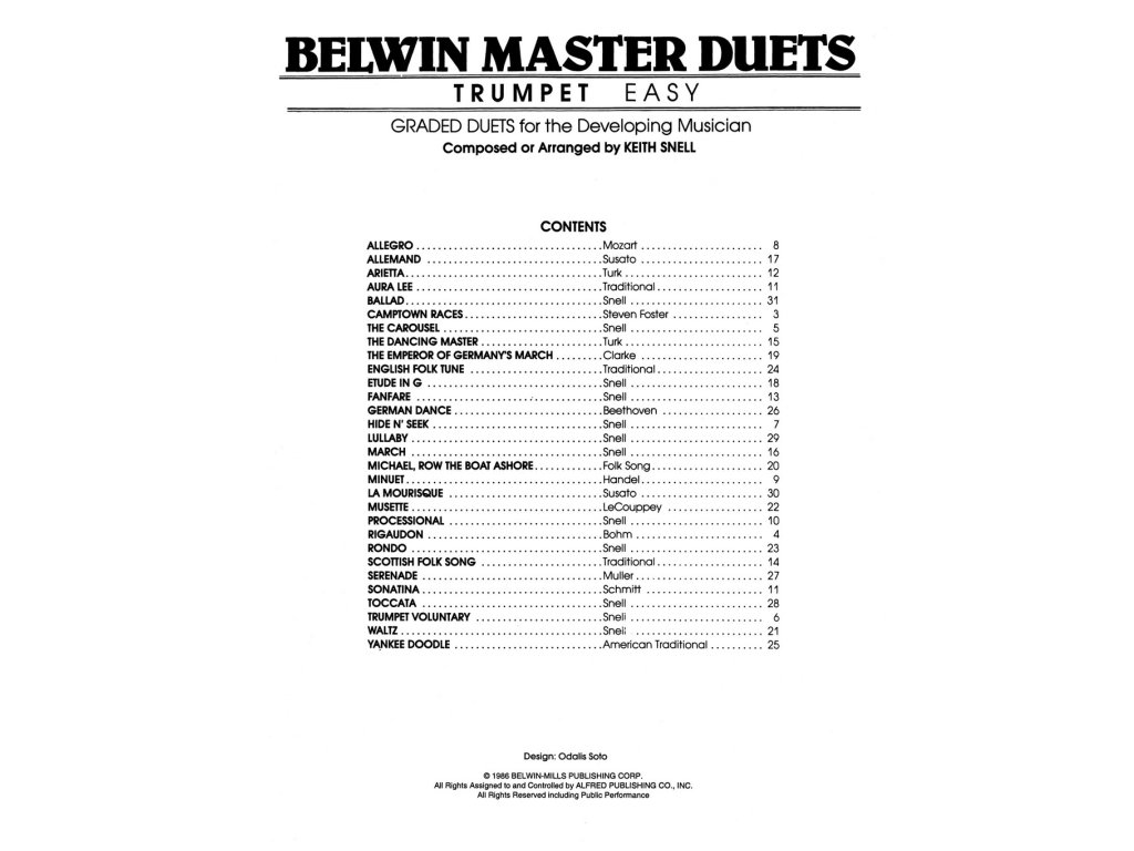 BELWIN MASTER DUETS je osvědčená a povedená série, která nabízí dueta pro studenty i učitelé na dechové nebo žesťové nástroje. Každý sešit obsahuje skladby z období renesance, baroka, klasiky, lidové písně a tradicionály. Tituly série BELWIN MASTER jsou velmi oblíbené, užitečné a vyhledávané zdroje přednesového repertoáru.