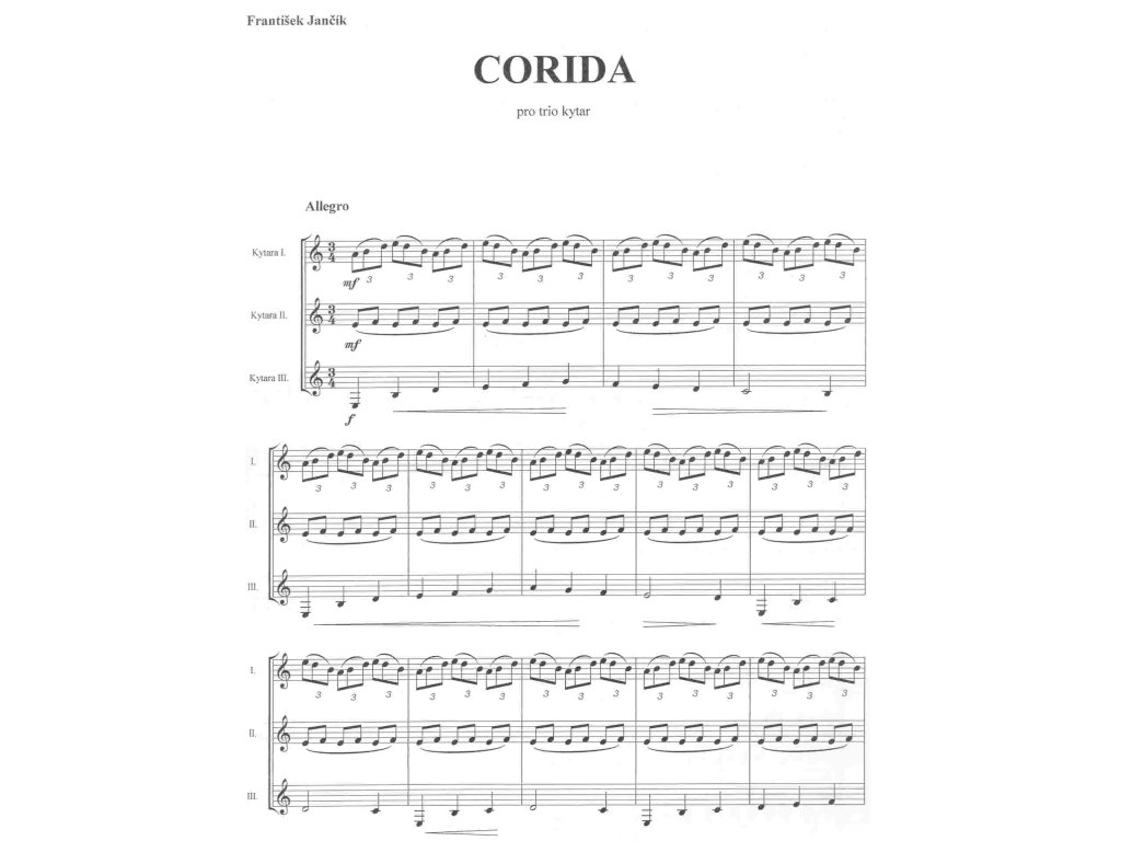 CORIDA je originální skladba pro tři kytary od Františka Jančíka. Titul obsahuje partituru plus samostatné party pro jednotlivé kytary.