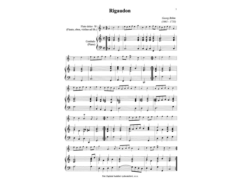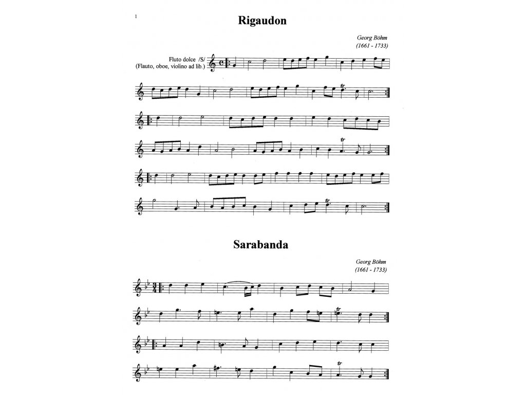 12 drobných skladeb z období baroka ve snadné úpravě pro zobcovou flétnu (příčnou flétnu, hoboj, housle) s klavírním (cembalovým) doprovodem. Sešit obsahuje klavírní doprovod plus samostatně vložený part pro sólový nástroj.
