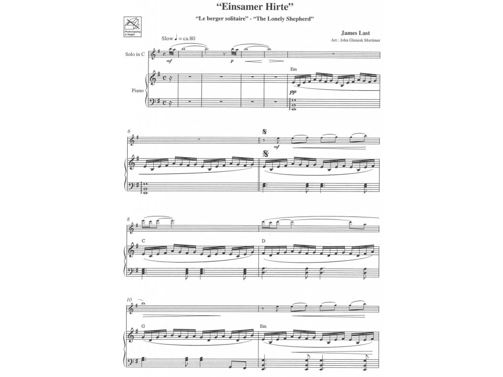 EINSAMER HIRTE / The Lonely Sheperd / Osamělý pastýř je nádherná melodie od James Last. Nyní Vám ji nabízíme v úpravě pro trumpetu s doprovodem klavíru. Titul obsahuje klavírní doprovod plus dva samostatné party pro C a Bb trumpetu.