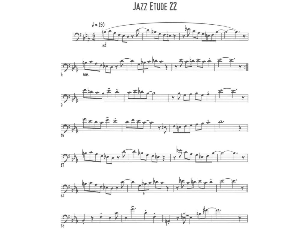 Výborný sešit pro všechny nástroje hrající v basovém klíči, který je plný jazzových cvičení a etud napsaných na základě vlastních zkušeností vynikajícím jazzovým trombonistou J.J.Johnson. Etudy jsou v sešitě řazeny podle obtížnosti od nejjednodušších po ty složitější. Titul by Vám měl pomoci nejen lépe zvládnou techniku hry, ale také základy jazzové řeči, jazzového jazyka. Jestliže improvizace je srdcem a duší jazzu, tak jazzový jazyk je srdcem a duší improvizace. Velmi povedený a mnohostranně použitelný sešit !!!