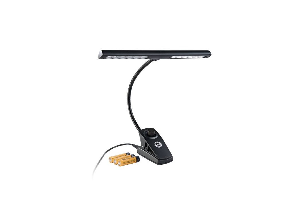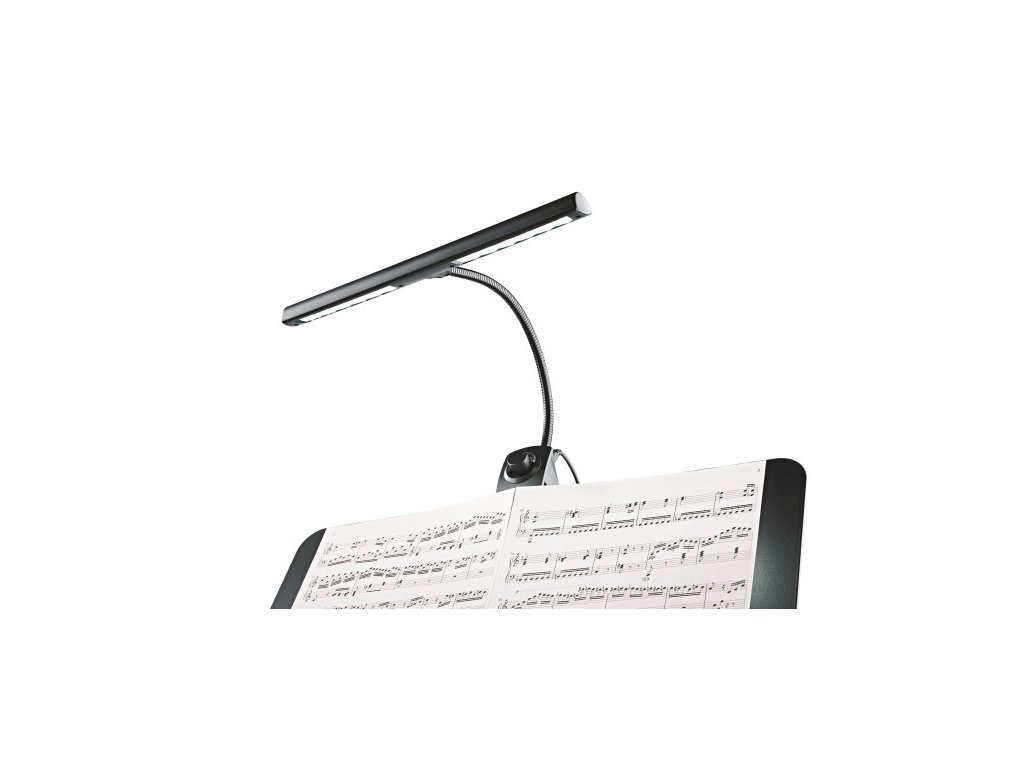 Táto lampa je ideálna pre všetkých hudobníkov, ktorí potrebujú spoľahlivé a rovnomerné osvetlenie notového stojana. Vďaka 12 úsporným a odolným LED diódám poskytuje stabilný a jasný svetelný výkon. Lampa je navrhnutá tak, aby ju bolo možné napájať buď z batérií, alebo zo sieťového adaptéra, pričom jas je možné plynulo regulovať pomocou stmievača. Flexibilný husí krk umožňuje presné nastavenie svetla, zatiaľ čo praktický klip zabezpečuje jednoduché upevnenie na stojany do hrúbky 25 mm. Súčasťou balenia sú batérie aj napájací adaptér, takže lampa je pripravená okamžite k použitiu.