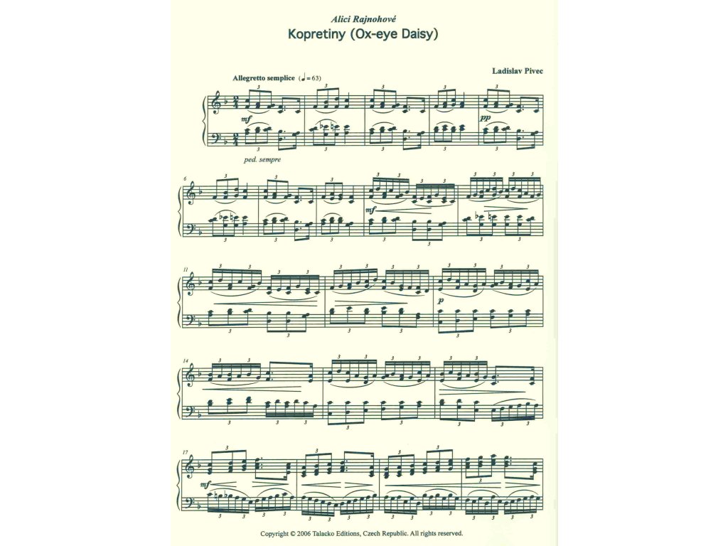 Sbírka Květiny od Ladislava Pivce (1934) je soubor šesti příjemných skladeb na motivy květin. Ladislav Pivec je především lyrikem a jeho skladby nabízí hudbu plnou hlubokého cítění, vlídného pohledu na svět, hudbu s vnitřním duchovním poselstvím, které se však nevnucuje, ale vyplývá přirozeně z tématického zaměření jednotlivých skladeb. Obtížnost 5+