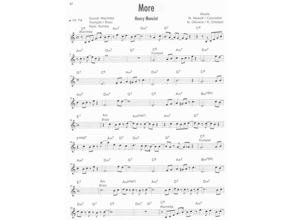 Kolekce 24 velkých hitů populární hudby, latiny a jazzu v úpravě melodická linka, akordové značky a klavírní part.