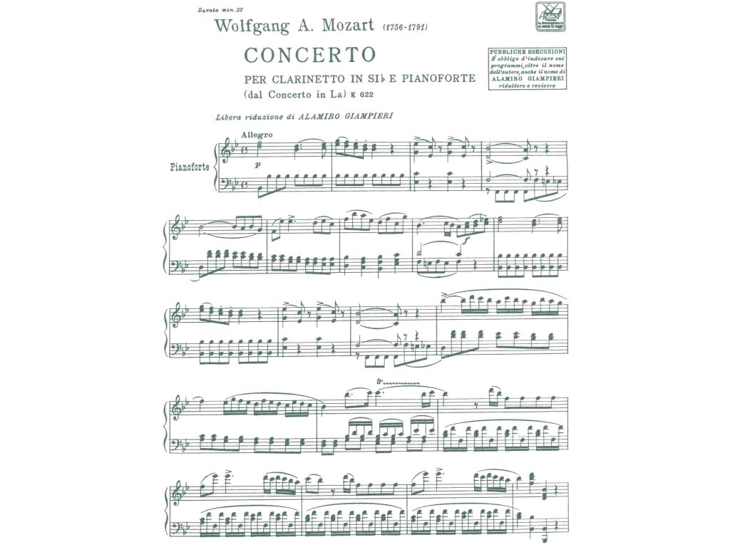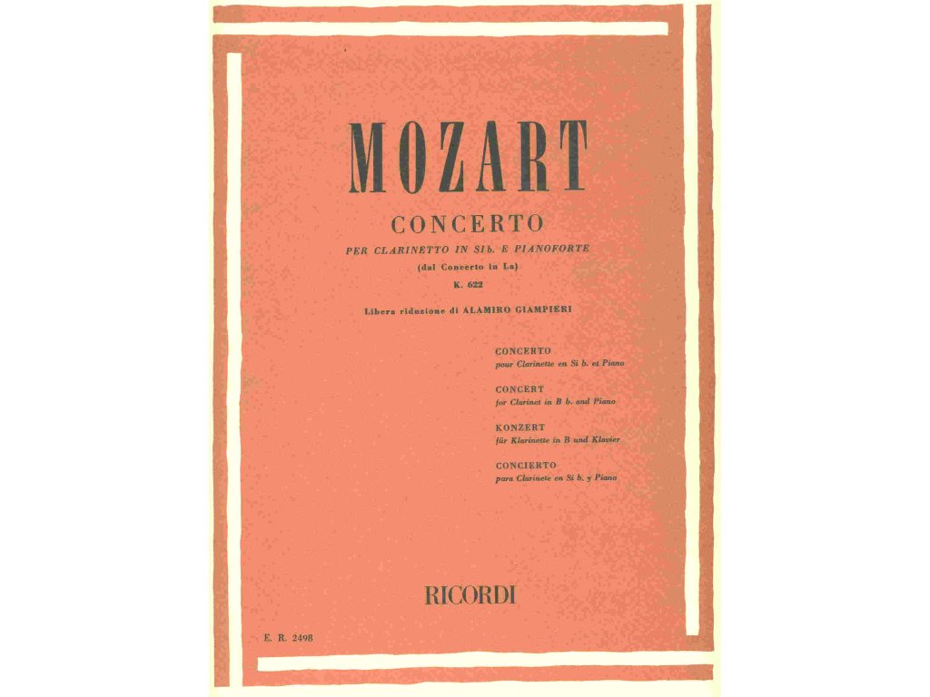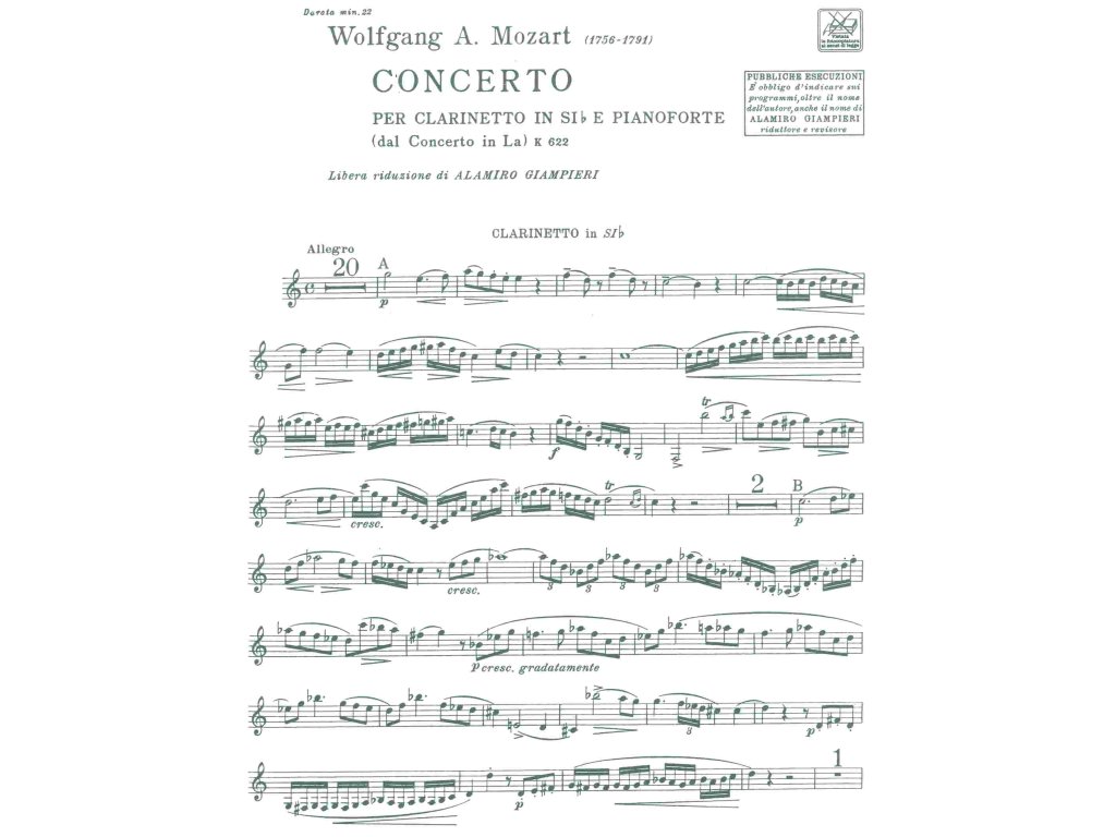 Slavný Mozartův CONCERT A Dur, OP. 107, K622 pro klarinet a orchestr, upravený pro dnešní Bb klarinet a klavír (piano reduction). Sešit obsahuje klavírní doprovod plus samostatný part pro klarinet.
