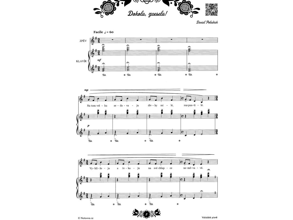 Kolekce 12 písní s doprovodem klavíru, které napsal Daniel Poledňák. Písně jsou vhodné pro střední hlas a přináší spoustu kontrastních interpretačních prvků, širokou paletu dynamiky, a především ojedinělé melodie i texty. Písně inspirovány Valašským Meziříčím, rodným městem Daniela Poledňáka. Cyklus vychází z klasické lidové melodiky, avšak s prvky soudobé hudby. Jednotlivé písně slouží k vyjádření tematickému přednesu a je potřeba k nim přistupovat zcela individuálně. Autor chtěl zpěvákům a studentům sólového zpěvu nabídnout svěží písně, díky kterým se lze rozvíjet po interpretační a pěvecko-technické stránce. Součástí publikace jsou také QR kódy, které Vám umožní přehrát si jednotlivé písně na mobilním telefonu pro Vaši představu jak znějí v podání autora.