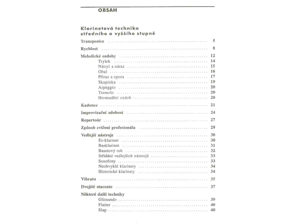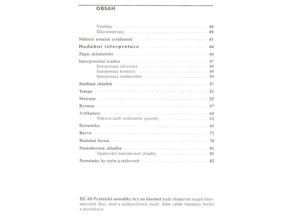 Třídílná publikace, která seznamuje čtenáře s klíčovými problémy výuky hry na klarinet, jak v počátečním stádiu na základních uměleckých školách (1. díl), tak v oblasti specializované a profesionální hudební výchovy (2. díl). Třetí díl obsahuje soupis veškeré klarinetové literatury. Publikace, které jsou doplněny řadou konkrétních notových ukázek s metodickými poznámkami, uvítají nejen studenti, ale i pedagogové základních, středních a vysokých hudebních škol.