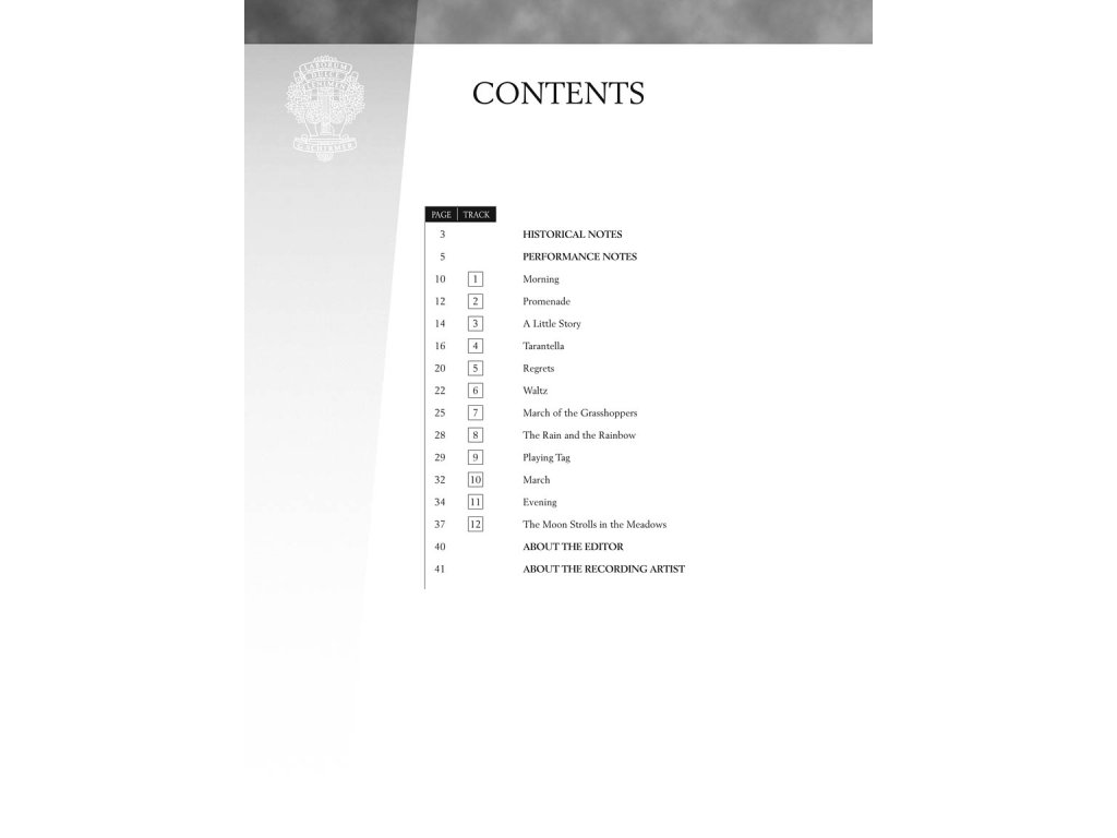 Tento titul Vám nabízí 12 jeho krásných drobných skladeb pro klavír, které se vyznačují překvapující lyrikou a harmonií pro kterou jsou jeho velké hudební díla tak známá. Nahrávky všech skladeb si můžete poslechnout nebo stáhnout na internetové adrese, která je společně s unikátním kódem uvedená na první stránce sešitu. Obtížnost 5+