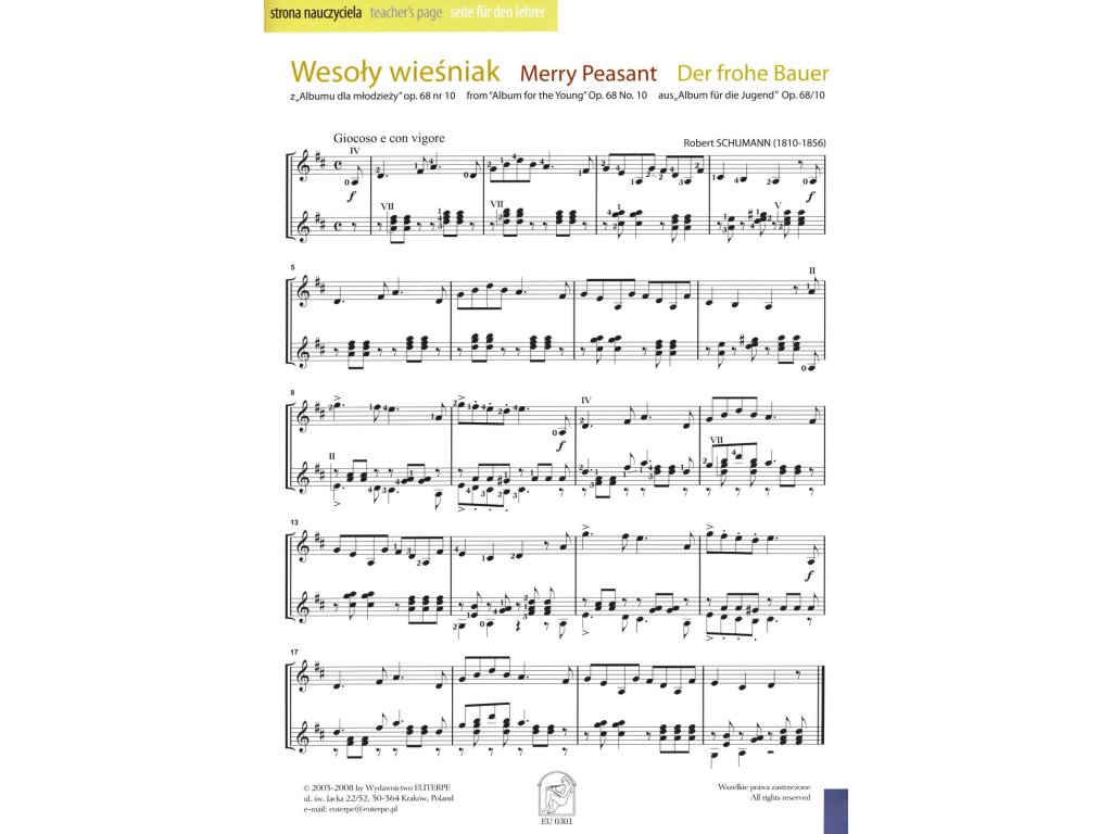 Tento sešit Vám nabízí první díl třídílné série snadných kytarových duet s názvem Žák a učitel. Základním cílem této série bylo napsat jednoduché kytarové sóla, které zahrají i nejmladší kytaristé s možností doprovodu jejich učitele. Snadné jednohlasé sólové kytarové party umožní mladým kytaristům vyhnout se náročnějším hmatům levé ruky a dovoluje jim se plně koncentrovat na nejdůležitější aspekty správného provedení skladby jako jsou dosažení správného tónu a frázování.