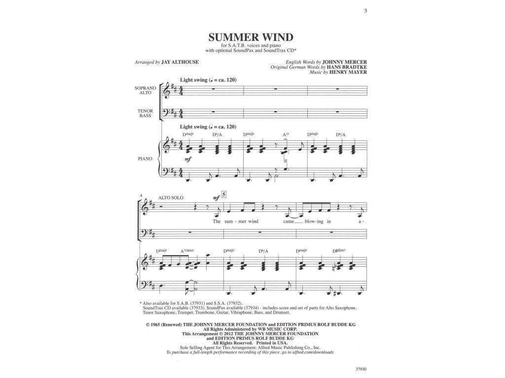 Frank Sinatra, Wayne Newton, Michael Bublé a mnoho dalších zpívalo píseň Summer Wind (Sluneční vítr), krásný americký standard. Nyní Vám tuto skladbu nabízíme v povedeném swingovém aranžmá pro SATB vokální soubor se skvělou pasáží pro scat. Klavírní doprovod včetně akordových značek.