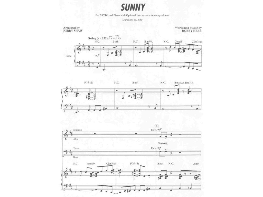 SUNNY skvělý pop hit z roku 1966, který byl společností BMI vydnocen jako 25 nejlepší skladba 20. století. Nyní Vám ji nabízíme ve skvělém jazzovém aranžmá od Kirby Shaw pro SATB vokální soubor. Klavírní doprovod včetně akordových značek. Délka skladby cca 3:30