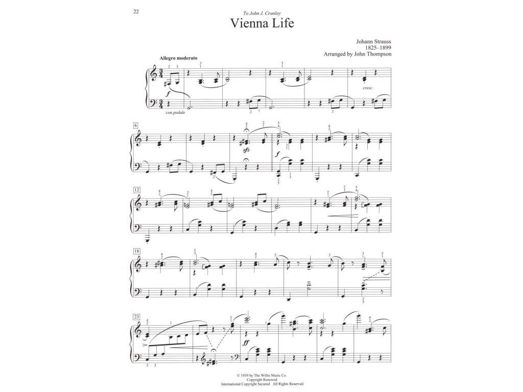 John Thompson (1889 - 1963), americký klavírista, skladatel a pedagog, se od mládí věnoval hudbě, vystudoval klavír na konzervatoři ve Philadelphii a kompozici na Pensylvánské univerzitě. Dnes Thompsonův největší přínos nacházíme v jeho metodických publikacích, které se těší velké popularitě nejen v USA, ale také po celém světě. Titul Waltzes Vám přináší jeho krásné aranžmá šesti známých valčíků pro středně pokročilé klavíristy. Obtížnost 5+